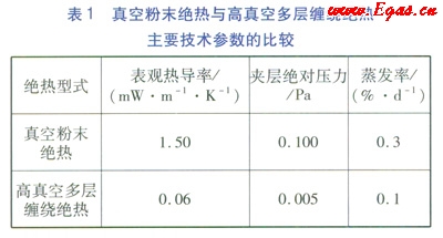 目前,在LNG加氣站的應(yīng)用中,LNG儲(chǔ)罐主要有真空粉末絕熱及高真空多層纏繞絕熱兩大類。真空粉末絕熱在絕熱空間充填多孔性絕熱材料(珍珠巖粉),對(duì)真空度的要求不高。與之相比,高真空多層纏繞絕熱由多層反射材料和間隔物交替纏繞而成,夾層抽成高真空,反射材料通常采用鋁箔或鍍鋁滌綸薄膜,間隔物一般采用玻璃纖維紙、植物纖維紙或尼龍網(wǎng)。由于高真空多層纏繞絕熱能有效地抑制熱輻射,因此,它具有優(yōu)良的絕熱性能。表1列出了在相同的邊界溫度條件下(300K)兩種絕熱型式的表觀熱導(dǎo)率和夾層真空度的對(duì)比,在環(huán)境溫度下兩種絕熱型式的LNG儲(chǔ)罐的蒸發(fā)率的對(duì)比??梢钥闯觯哒婵斩鄬永p繞絕熱結(jié)構(gòu)的絕熱性能要明顯優(yōu)于真空粉末絕熱。