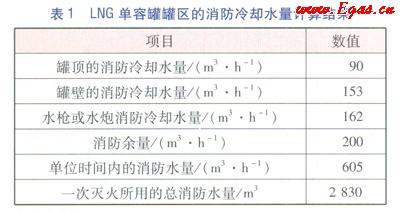 LNG單容罐罐區(qū)的消防冷卻水量計算結(jié)果見表1。