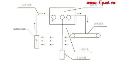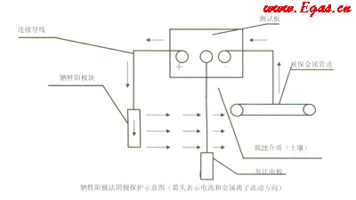 針對(duì)埋地管道電解化學(xué)腐蝕的過(guò)程和實(shí)際情況,我們應(yīng)從兩方面解決管道的防腐問(wèn)題。一是加強(qiáng)管道的絕緣性:①管道第一層涂環(huán)氧粉末;②第二層涂聚乙烯(PE);③第三層涂EVA樹脂。增火回路電阻,減少腐蝕電流。二是用犧牲陽(yáng)極保護(hù)法,對(duì)管道進(jìn)行陰極保護(hù)。見(jiàn)示意圖:
