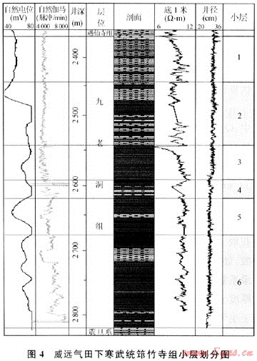 容積法估算中,依據(jù)威遠(yuǎn)氣田區(qū)筇竹寺組巖性和電性特征(圖4),在圖3基礎(chǔ)上,將威遠(yuǎn)氣田區(qū)筇竹寺組劃分為6個(gè)小層(見表4)。