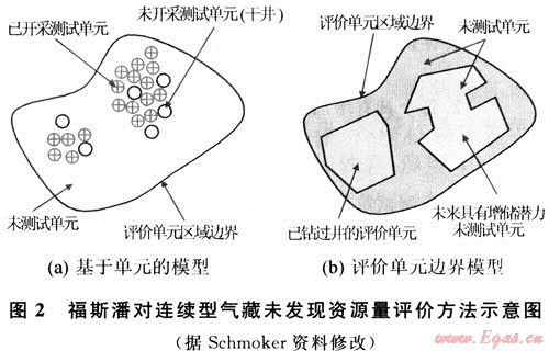 福斯潘模型(FORSPAN)法是USGS在1999年為連續(xù)型油氣藏資源評價(jià)而提出的一種評價(jià)方法。該方法以連續(xù)型油氣藏的每一個(gè)含油氣單位為對象進(jìn)行資源評價(jià),即假設(shè)每個(gè)單元都有油氣生產(chǎn)能力,但各單元間汗油氣性(包括經(jīng)濟(jì)性)可以相差很大,以概率形式對每個(gè)單元的資源潛力作出預(yù)測。以往也用體積法對連續(xù)型油氣藏資源潛力作過評價(jià)。在體積法中,原始資源量估算常用的參數(shù)主要是一些基本地質(zhì)參數(shù)(如面積、厚度、孔隙度等),這些參數(shù)有很大的不確定性,且各單元間關(guān)系密切、缺乏獨(dú)立性。因此,參數(shù)選取及標(biāo)準(zhǔn)確定較困難。福斯潘(FORSPAN)法建立在已有開發(fā)數(shù)據(jù)基礎(chǔ)上(圖2),估算結(jié)果為未開發(fā)原始資源量。因此,該方法適合于已開發(fā)單元的剩余資源潛力預(yù)測。已有的鉆井資料主要用于儲層參數(shù)(如厚度、含水飽和度、孔隙度、滲透率)的綜合模擬、權(quán)重系數(shù)的確定、最終儲量和采收率的估算。如果缺乏足夠的鉆井和生產(chǎn)數(shù)據(jù),評價(jià)可依賴各參數(shù)的類比取值。