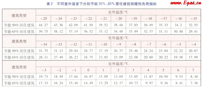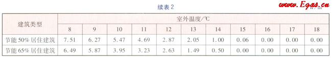 根據(jù)文獻(xiàn)[1]及GB 50736—2012《民用建筑供暖通風(fēng)與空氣調(diào)節(jié)設(shè)計(jì)規(guī)范》、JCJ 26—2010《嚴(yán)寒和寒冷地區(qū)民用建筑節(jié)能設(shè)計(jì)標(biāo)準(zhǔn)》、JGJ 26—5《民用建筑節(jié)能設(shè)計(jì)標(biāo)準(zhǔn)(供暖居住建筑部分)》規(guī)定的汁算參數(shù),以烏魯木齊市供熱區(qū)域內(nèi)某居住建筑為例,進(jìn)行能耗分析。該建筑坐北朝南,共6層,建筑高度為16.8m,總建筑面積為4112.64m2,體形系數(shù)為0.28。節(jié)能50%居住建筑外墻傳熱系數(shù)為0.43W/(m2·K),外窗的傳熱系數(shù)為2.47W/(m2·K);節(jié)能65%居住建筑外墻傳熱系數(shù)為0.35W/(m2·K),外窗傳熱系數(shù)為1.8W/(m2·K)。計(jì)算得出不同室外溫度(室外溫度取整數(shù))時(shí),該居住建筑分別節(jié)能65%、50%時(shí)的供暖熱負(fù)荷指標(biāo),計(jì)算結(jié)果見(jiàn)表2。當(dāng)室外溫度達(dá)到16℃時(shí),鍋爐停止供暖,熱負(fù)荷指標(biāo)為0,但由于烏魯木齊的晝夜溫差可逾20℃,因此存在白天停止供暖,傍晚及夜間又恢復(fù)供暖的情況。