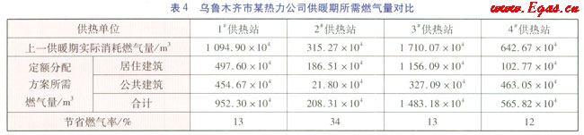 按照定額分配方案,將供暖熱負(fù)荷指標(biāo)代入上述公式,計(jì)算出不同室外溫度下單位時(shí)間所需燃?xì)饬?,進(jìn)而推算出在烏魯木齊的氣象條件下,各供熱單位在一個(gè)供暖期(183d)內(nèi)所需燃?xì)饬浚⑴c實(shí)際消耗燃?xì)饬窟M(jìn)行比較,比較結(jié)果見(jiàn)表4。
