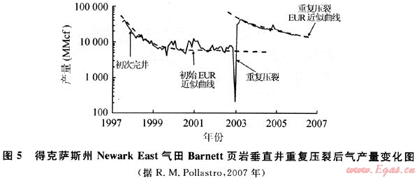 當頁巖氣井初始壓裂處理已經(jīng)無效或現(xiàn)有的支撐劑因時間關系損壞或質量下降,導致氣體產(chǎn)量大幅下降時,重復壓裂能重建儲層到井眼的線性流,恢復或增加生產(chǎn)產(chǎn)能,可使估計最終采收率提高8%~10%,可采儲量增加60%,是一種低成本增產(chǎn)方法。該方法有效地改善單井產(chǎn)量與生產(chǎn)動態(tài)特性,在頁巖氣井生產(chǎn)中起著積極作用,壓裂后產(chǎn)量接近甚至超過初次壓裂時期。美國天然氣研究所(GRI)研究證實,重復壓裂能夠以0.1美元/mcf(1mcf=28.317m3)的成本增加儲量,遠低于收購天然氣儲量0.54美元/mcf或發(fā)現(xiàn)和開發(fā)天然氣儲量0.75美元/mcf的平均成本[16]。如圖5所示,得克薩斯州Newark East氣田Barnett頁巖新井完井和老井采用重復壓裂方法壓裂后,頁巖氣井產(chǎn)量與估計最終可采儲量都接近甚至超過初次壓裂時期(圖5)[17]。