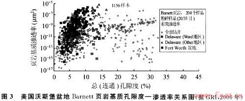 4) 頁巖氣藏儲(chǔ)層具典型的低孔低滲物性特征,頁巖產(chǎn)層厚度一般為15~100m,孔隙度一般為4%~6%,滲透率小于0.001×10-3μm2(見圖3)。處于斷裂帶或裂縫發(fā)育帶的頁巖儲(chǔ)層滲透率可以增加,孔隙度最高可達(dá)11%,滲透率可達(dá)1×10-3μm2左右[1]。據(jù)美國主要頁巖氣產(chǎn)層儲(chǔ)層物性統(tǒng)計(jì),孔隙度為4.22%~6.51%,滲透率為40.9×10-6μm2。