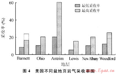 據(jù)美國5個(gè)主要頁巖氣產(chǎn)氣盆地的統(tǒng)計(jì),頁巖氣藏的采收率變化范圍為5%~60%(見圖4)。如埋藏較淺、地層壓力較低、有機(jī)質(zhì)豐度較高、吸附氣含量較高的Antrim頁巖氣藏的采收率可達(dá)60%;而埋藏較深、地層壓力較高、吸附氣所占比例相對(duì)較低的Barnett頁巖氣藏的采收率早期為7%~8%,隨著水平井和壓裂技術(shù)的進(jìn)步,目前的采收率達(dá)到16%,預(yù)計(jì)最終可達(dá)25%左右。