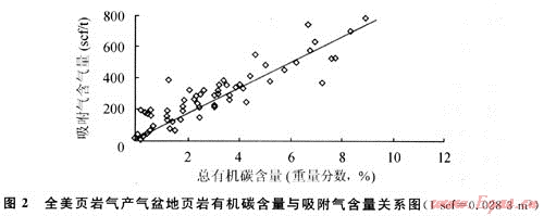 2) 頁巖氣主要由吸附氣和游離氣兩部分組成。其中基質(zhì)孔隙和裂縫中的游離氣的儲(chǔ)集方式與常規(guī)天然氣儲(chǔ)層相似;有機(jī)質(zhì)與黏土顆粒表面的吸附氣的儲(chǔ)集方式與煤層氣相似。不同地質(zhì)條件下游離氣與吸附氣的相對(duì)比例有很大差別[2]。影響游離氣量大小的主要因素是頁巖基質(zhì)孔隙的大小和天然裂縫的發(fā)育程度,二者為正相關(guān)關(guān)系;影響吸附氣多寡的關(guān)鍵因素是有機(jī)碳含量的高低,二者同樣具正相關(guān)性(見圖2)。