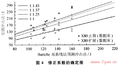 新頒布的ISO 3183 2007中給出了幾種常用的止裂韌性預(yù)測方法的適用范圍(見表2)??梢姡瑢τ谖鞫€,只有Battelle雙曲線法適用。ISO 3183—2007進(jìn)一步指出,當(dāng)預(yù)測結(jié)果大于100J時,應(yīng)對預(yù)測結(jié)果進(jìn)行修正。而修正系數(shù)是由已經(jīng)進(jìn)行的全尺寸實物爆破試驗結(jié)果確定的。由圖4得出西二線止裂韌性修正系數(shù)為1.43。幾種預(yù)測結(jié)果對比如表3所示。