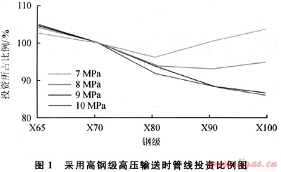 在日益激烈的市場競爭中,全球各石油公司都在不斷尋找降低成本的途徑。在管線項目投資中,鋼管的成本占40%左右,采用高鋼級管線鋼管可以減小壁厚,高壓輸送可以在不改變輸量的情況下減小管徑。管徑和壁厚的減小可帶來工程費用的降低。因此,采用高鋼級管線鋼管和高壓輸送可有效降低輸送成本。在1998年舉行的國際管道會議上,加拿大的NOVA公司介紹了該公司采用高鋼級管線鋼管和高壓輸送的效益情況[5]。圖1所示為采用不同鋼級管線鋼管和不同輸送壓力時管線的投資對比情況[5]??梢?,在高壓輸送時,采用高鋼級管線鋼管可明顯降低管道成本。