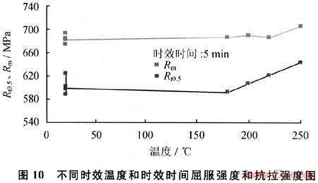 應(yīng)變時效是鋼經(jīng)過冷塑性變形后,在室溫長時間放置或稍加熱后,其力學(xué)性能發(fā)生變化(通常是屈服強度增高,屈強比提高,并伴有塑性和韌性降低)現(xiàn)象。原因是存在于鋼中的溶質(zhì)組元如C、N原子通過擴(kuò)散在位錯周圍偏聚,形成柯氏(Cottrell)氣團(tuán),使位錯運動變得困難,導(dǎo)致屈服強度升高。圖10為X80鋼管在不同時效條件下屈服強度和抗拉強度的變化情況。由圖10可見,隨著時效溫度升高和時效時間的延長,鋼管的抗拉強度變化不明顯,但屈服強度則明顯上升。在實際防腐過程中,時間一般只有5min左右。而從試驗結(jié)果來看,防腐溫度在200℃以下時,屈服強度沒有明顯變化。因此可以規(guī)定防腐時的加熱溫度不宜超討200℃。