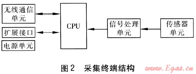 采集終端包括傳感器單元、信號(hào)處理單元、系統(tǒng)控制(CPU)單元、無(wú)線通信單元和電源單元等。采集終端結(jié)構(gòu)見圖2。