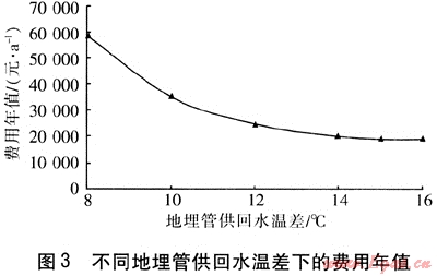 當(dāng)?shù)責(zé)嶝?fù)荷比例為80%、地埋管外徑為25mm時(shí),對(duì)地埋管供回水溫差進(jìn)行優(yōu)化。不同地埋管供回水溫差下的費(fèi)用年值見(jiàn)圖3。由圖3可知,費(fèi)用年值在地埋管供回水溫差為15℃時(shí)最小。通過(guò)設(shè)計(jì)參數(shù)優(yōu)化設(shè)計(jì)可知,當(dāng)?shù)責(zé)嶝?fù)荷比例為80%、地埋管供回水溫差為15℃、地埋管外徑為25mm時(shí),地?zé)崴疁厥夜嵯到y(tǒng)的經(jīng)濟(jì)性最好。