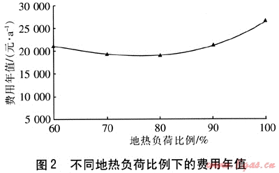 選取適中的地埋管回水溫度(30℃)、地埋管外徑(25mm),不同地?zé)嶝?fù)荷比例下的費(fèi)用年值見(jiàn)圖2。由圖2可知,采用適中的地?zé)嶝?fù)荷比例,可獲得較低的費(fèi)用年值。通過(guò)分析計(jì)算,不同供回水溫差、地埋管外徑下均存在類(lèi)似的規(guī)律,因此可以確定地?zé)嶝?fù)荷比例為80%時(shí),系統(tǒng)的經(jīng)濟(jì)性最好。