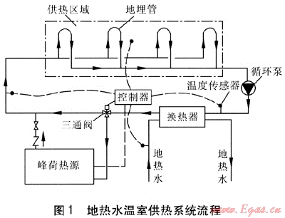 地?zé)崴疁厥夜嵯到y(tǒng)流程(見(jiàn)圖1)由換熱器、地埋管、峰荷熱源、循環(huán)泵、溫度傳感器、控制器、三通閥等組成。換熱器將地?zé)崴c供熱介質(zhì)隔開(kāi),防止地?zé)崴畬?duì)供熱管道的腐蝕及結(jié)垢。地埋管安裝在溫室內(nèi)地面下,向溫室散熱??刂破髟诓杉覂?nèi)溫度、供熱介質(zhì)供回水溫度和地?zé)崴疁囟葦?shù)據(jù)的基礎(chǔ)上,進(jìn)行分析計(jì)算,控制三通閥的啟閉和峰荷熱源工作狀態(tài),調(diào)節(jié)補(bǔ)充熱量,滿足供熱要求。在設(shè)計(jì)地?zé)崴疁厥夜嵯到y(tǒng)時(shí),需要掌握的地?zé)峋畢?shù)為:地?zé)崴疁囟?、水量、水位、水質(zhì)狀況。地?zé)崴疁囟?、水量可以確定地?zé)崴淖畲蠊嶝?fù)荷,地?zé)崴挥糜跐撍玫倪x型,水質(zhì)狀況用來(lái)判斷地?zé)崴母g結(jié)垢趨勢(shì)。