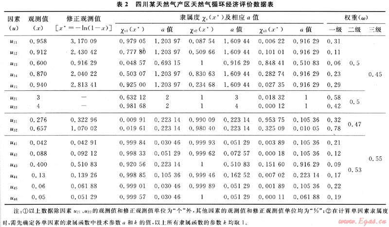 以四川某天然氣產(chǎn)區(qū)為例,通過到天然氣生產(chǎn)企業(yè)和相關(guān)政府部門調(diào)研討論,并依據(jù)各單因素指標(biāo)數(shù)據(jù)以及各指標(biāo)權(quán)重,計算各方面數(shù)據(jù),整理如表2。