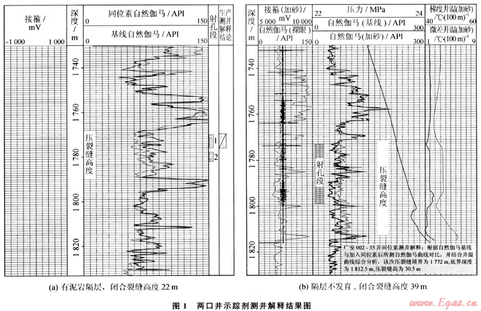 在壓裂施工中加入示蹤劑,通過壓后井溫度測井和示蹤劑確定縫口裂縫高度。通過對裂縫高度測量,可以對泥巖隔層的遮擋性和儲層裂縫高度延伸規(guī)律進(jìn)行研究,進(jìn)一步優(yōu)化壓裂設(shè)計,與壓裂數(shù)據(jù)共同分析,確定裂縫有效幾何形態(tài)(圖1)。