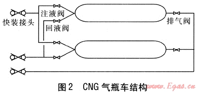 本文中的CNG氣瓶車是在普通CNG氣瓶車基礎上改裝而成的,其結構見圖2。每輛CNG氣瓶車都有8個儲氣瓶,為了簡化圖形,圖中只畫出2個儲氣瓶。儲氣瓶兩端的注液閥、回液閥和排氣閥都是常閉型氣動球閥,向氣動球閥的氣缸充壓縮空氣則氣動球閥開啟;氣缸泄氣則氣動球閥關閉。