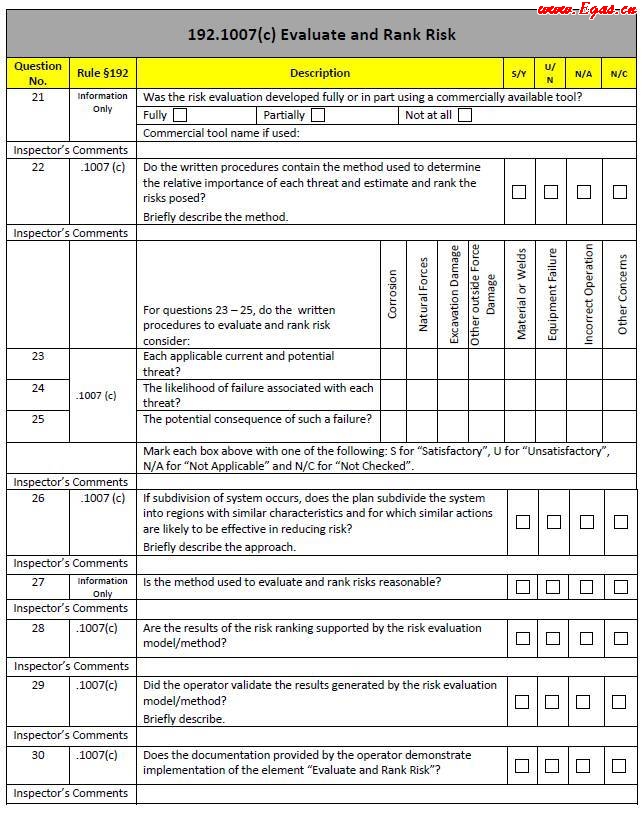 由PHMSA于2011年9月制定和發(fā)布。用于檢查和評價燃氣運營企業(yè)開展完整性管理情況,檢查手冊(示例見圖 5)以表格和提問形式進行檢查。對于問題的回答有S/Y、U/N和N/A三種形式,其中S/Y表示是或者滿足條件,U/N表示不是或者不滿足條件,N/A表示標準不適用或者未進行檢查。燃氣企業(yè)也可利用該檢查手冊進行自檢,以完善其完整性管理水平。