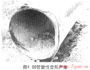 另外,施工單位應(yīng)有回拖時(shí)卡管情況下的應(yīng)急預(yù)案,龍大高速穿越卡管發(fā)生在第三塊孤石處,此時(shí)只需稍微后拉一下的擾動(dòng),再重新回拖時(shí)就可能錯(cuò)過(guò)卡點(diǎn)。由于管道浮在泥漿中,這是不難做到的,而一味強(qiáng)拖則會(huì)越卡越緊。由于施工單位沒有合適的應(yīng)急預(yù)案,結(jié)果發(fā)生卡管時(shí)應(yīng)對(duì)失當(dāng),先是長(zhǎng)時(shí)間停泵使泥漿干涸凝固,而后又在沒有鉆機(jī)有效引導(dǎo)情況下,用夯管錘暴力全程強(qiáng)夯,結(jié)果管段偏離管孔前行,導(dǎo)致鋼管塑性變形嚴(yán)重超標(biāo)(圖4)。