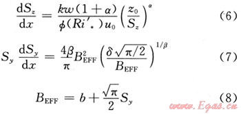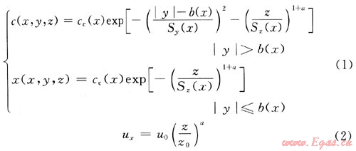 式中下風(fēng)向不同距離處的擴散系數(shù)Sy(x)、Sz(x),以及特征寬度b(x)、密度ρ(x)和溫度T(x)的求解,需要滿足下列守恒及特征擴散參數(shù)關(guān)系。