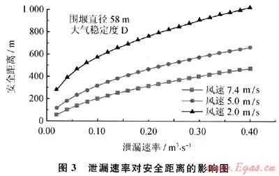 在給定風(fēng)速條件下,隨著泄漏速率增加,下風(fēng)向的安全距離也隨之增大(如圖3所示)。泄漏速率大小是影響穩(wěn)態(tài)重氣擴散安全距離的決定因素。