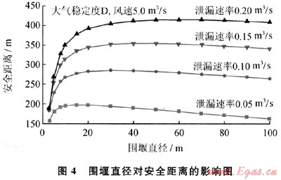 LNG儲罐周圍通常要設(shè)計圍堰,以防止儲罐發(fā)生泄漏時,液體四處流淌蔓延,若發(fā)生火災(zāi),還可以防止火焰蔓延到周邊地區(qū)[4]。LNG泄漏到圍堰內(nèi),會迅速蒸發(fā)氣化,形成以圍堰為二次源的蒸氣云團擴散。圖4給出下風(fēng)向安全距離隨著圍堰直徑和泄漏速率的變化。當(dāng)圍堰尺寸較小時,以圍堰為二次源云團的范圍也較小,有限的蒸發(fā)氣受大氣湍流影響,其濃度較快稀釋,安全距離較小;當(dāng)圍堰尺寸過于增大時,二次源云團的天然氣濃度較低,其下風(fēng)向擴散距離不再增加,反而略有減少。