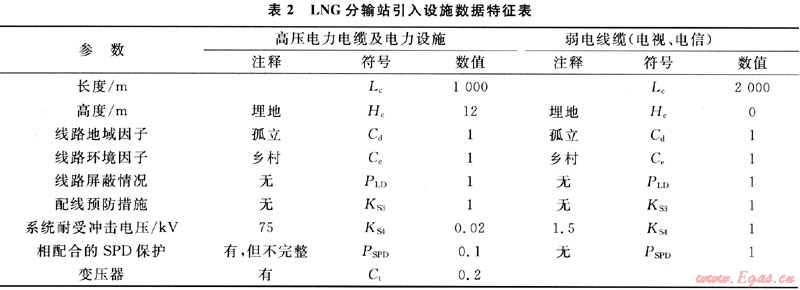 LNG分輸站電力系統(tǒng)由當(dāng)?shù)仉姌I(yè)局敷設(shè),將市電電源架空進(jìn)線裝于10kV電桿上引至LNG分輸站內(nèi)變、配電房,經(jīng)帶保護(hù)外殼干式變壓器變壓后向LNG分輸站內(nèi)設(shè)備供電。經(jīng)檢測,高壓架空線電桿高度Hc為12m,詳見表2,而經(jīng)查詢上述變壓器參數(shù)資料,得出系統(tǒng)耐受沖擊電壓為75kV。因此KS4為0.02(1.5/75),詳見表2。