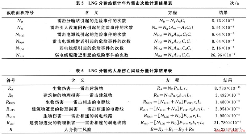 選定相關(guān)參數(shù)后,根據(jù)規(guī)范IEC60305中給定的公式,先后計算出建(構(gòu))筑物及引入設(shè)施截收面積(結(jié)果見表4)、預(yù)計年累計次數(shù)(結(jié)果見表5)、人身傷亡風(fēng)險分量(結(jié)果見表6)等值(表4~6中方程引自本文參考文獻(xiàn)[3])。
