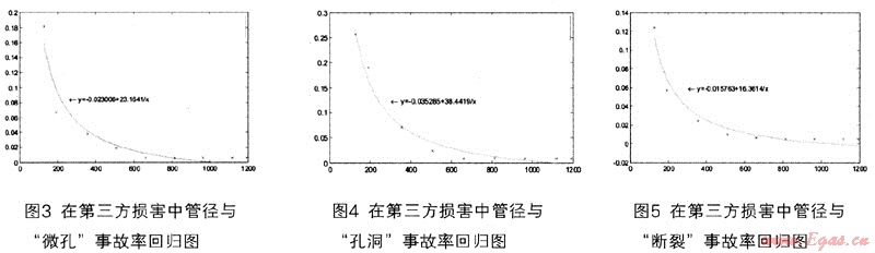 根據(jù)表2數(shù)據(jù)以管徑為自變量(橫坐標(biāo)),事故率為因變量(縱坐標(biāo))繪制散點(diǎn)圖,觀察散點(diǎn)圖發(fā)現(xiàn)事故率與管徑存在遞減的函數(shù)關(guān)系,可以利用曲線線性回歸分析的辦法進(jìn)行試算,可供選擇和函數(shù)關(guān)系有:冪函數(shù)y=xa、指數(shù)函數(shù)y=ax、對數(shù)函數(shù)y=logax。經(jīng)過試算發(fā)現(xiàn)冪函數(shù)的擬合效果最好,確定為事故率回歸分析的函數(shù)類型。