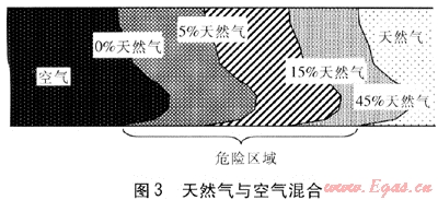 天然氣直接置換方法的特點(diǎn)是比較簡便也比較經(jīng)濟(jì),但是具有一定的危險(xiǎn)性。因?yàn)樵谥脫Q過程中,管道里必然要產(chǎn)生天然氣與空氣的混合氣體,天然氣的前部氣體與空氣混合后,有一部分的混合氣在爆炸極限內(nèi),很容易在某外界因素的誘發(fā)下(如管道內(nèi)焊渣、金屬顆粒滾動(dòng)等)產(chǎn)生爆炸,因此操作有嚴(yán)格的控制條件和要求,必須嚴(yán)格按規(guī)程實(shí)施,否則非??赡馨l(fā)生事故。對(duì)于天然氣來講,它的爆炸極限為5%~15%,再考慮到其混合的不均勻性,天然氣體積分?jǐn)?shù)在45%以下均應(yīng)視為危險(xiǎn)區(qū)(見圖3,圖中數(shù)據(jù)均為體積分?jǐn)?shù)),遇火源就要發(fā)生爆炸。為此必須嚴(yán)格控制,采取各種安全措施,確保無火源。