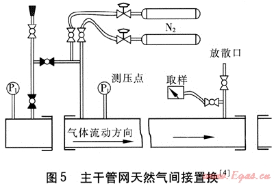 間接置換方法具體操作過程是先將惰性氣體注入管道,在管道末端放散,使用惰性氣體置換出空氣,直至放散管取樣口惰性氣體的體積分?jǐn)?shù)達(dá)到預(yù)定的置換標(biāo)準(zhǔn)為止。在實(shí)際操作過程中一般用氧氣體積分?jǐn)?shù)來衡量,如果連續(xù)2次取樣中的氧氣體積分?jǐn)?shù)達(dá)到2%以下即為合格[1](在英國的置換要求中,此數(shù)據(jù)為連續(xù)2次測(cè)得取樣中的氧氣體積分?jǐn)?shù)達(dá)到4%以下即為合格[2]),停止通入惰性氣體。然后再將天然氣通入管道,同樣操作,在檢測(cè)管的取樣口取樣,用高精度燃?xì)鈾z測(cè)儀進(jìn)行實(shí)時(shí)的監(jiān)測(cè)分析,如果連續(xù)2次測(cè)得天然氣體積分?jǐn)?shù)達(dá)到95%以上即為合格[1](在英國的置換要求中,此數(shù)據(jù)為連續(xù)2次測(cè)得天然氣體積分?jǐn)?shù)達(dá)到90%以上即為合格[2]),置換完成。此法操作復(fù)雜、繁瑣,進(jìn)行2次換氣,不僅耗用大量惰性氣體還耗用大量的燃?xì)?,費(fèi)用較高,并且換氣時(shí)間長,工作量大。但是,它可以確保進(jìn)入管道內(nèi)的燃?xì)獠粫?huì)與管道內(nèi)空氣接觸,不會(huì)形成具有爆炸性的混合氣體。因此,此法可靠性好,安全系數(shù)高,成功率也高。主干管網(wǎng)天然氣間接置換見圖5[4]。