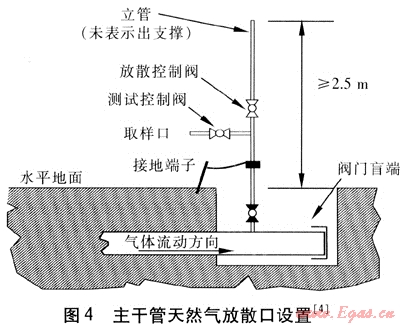 由于天然氣管道是封閉的,管道建成后經(jīng)歷了吹掃、強(qiáng)度試驗(yàn)、嚴(yán)密性試驗(yàn)等工序,管道內(nèi)沒有活動(dòng)部件,不可能因運(yùn)動(dòng)、撞擊產(chǎn)生火花。可能出現(xiàn)的火源有以下兩種:一是高速氣流會(huì)因摩擦產(chǎn)生靜電,所以置換時(shí)要對(duì)管道系統(tǒng)進(jìn)行接地(見圖4[4]),即便有靜電負(fù)荷產(chǎn)生,也會(huì)立即通過接地裝置導(dǎo)入大地,不會(huì)有電荷積聚導(dǎo)致高電位而產(chǎn)生放電火花。二是高速氣流吹動(dòng)管道中可能殘留下來的石塊、鐵屑、焊條頭等固體物質(zhì),與管道內(nèi)壁碰撞產(chǎn)生火花。引起此類事故的根本原因是高速氣流,解決的關(guān)鍵是確保氣流的低速,這樣即便有石塊等雜物,也不會(huì)被吹動(dòng),也就不可能產(chǎn)生火花。此外,為了避免將雜物帶進(jìn)管道,應(yīng)事先在進(jìn)氣管道上設(shè)置過濾器。根據(jù)英國相關(guān)資料及國內(nèi)應(yīng)用經(jīng)驗(yàn),我們將置換管道用天然氣的氣流速度控制在最小置換流速以上,一般最大流速控制在3m/s以下。在置換過程中采用流速計(jì)或U型壓力表觀察管道升壓速度的辦法來測(cè)量其充氣流速,用閥門的開度來控制流速(混氣過程中控制閥前的壓力要保持穩(wěn)定)。