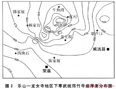 2) 下寒武統(tǒng)頁(yè)巖地層:分布面積大、范圍廣,可及整個(gè)揚(yáng)子地臺(tái)區(qū),現(xiàn)今殘留面積約90×104km2。烴源巖厚度50~500m,其中厚度大于50m以上烴源巖面積約58×104km2。發(fā)育的層位相當(dāng)穩(wěn)定,以下寒武統(tǒng)筇竹寺組為主,與之相當(dāng)?shù)倪€有川黔鄂地區(qū)的牛蹄塘組或水井沱組、蘇浙皖地區(qū)的荷塘組、冷泉王組等。巖性主要為暗色頁(yè)巖、黑色碳質(zhì)頁(yè)巖、碳硅質(zhì)頁(yè)巖、黑色粉砂質(zhì)頁(yè)巖。上揚(yáng)子地區(qū)的滇東、黔東北地區(qū)的頁(yè)巖地層普遍含磷,下?lián)P子地區(qū)夾石煤層。有機(jī)碳含量多在2.0%以上,最高可達(dá)13.64%,平均為2.77%。四川盆地下寒武統(tǒng)筇竹寺組井下樣品測(cè)試,有機(jī)碳含量平均為0.36%~5.03%,露頭樣品分析,有機(jī)碳含量平均為1.92%~2.35%(表3)。母質(zhì)類(lèi)型以腐泥型干酪根為主,少量為腐殖型。干酪根δ13C為-29.82‰~-32.92‰(PDB),平均為-30.88‰,成烴潛力大。上揚(yáng)子與下?lián)P子地區(qū)頁(yè)巖演化程度較高,Ro一般大于3%,最高可至5%及以上;中揚(yáng)子地區(qū)頁(yè)巖的演化程度略低,Ro為2.0%~3.0%,部分還小于2.0%。目前在揚(yáng)子區(qū)已發(fā)現(xiàn)的古油藏,如貴州甕安古油藏、麻江古油藏、銅仁古油藏、浙江泰山古油藏、湘西南山坪古油藏、紹興坡塘古油藏等,油源均來(lái)自于下寒武統(tǒng)烴源巖。下寒武統(tǒng)烴源巖的分布范圍、厚度及有機(jī)碳含量在區(qū)域上基本穩(wěn)定,差異不大。上揚(yáng)子地區(qū)的四川盆地南部地區(qū)烴源巖厚度為200~400m,有機(jī)碳含量0.5%~5.00;至黔北、五陵、湘鄂西地區(qū)烴源巖厚度為50~500m,有機(jī)碳含量為0.5%~3.0%;江南隆起北緣生油區(qū)烴源巖厚度為200~400m,有機(jī)碳含量為0.5%~2%,至下?lián)P子地區(qū)西北部生油區(qū)烴源巖厚度是50~120m,有機(jī)碳含量為0.5%~5%;皖南、蘇南生油區(qū)烴源巖相對(duì)不發(fā)育,厚度在50m左右,有機(jī)碳含量為0.50~4%。下寒武統(tǒng)烴源巖生烴強(qiáng)度較高,部分地區(qū)為(100~200)×108m3/km2。四川盆地下寒武統(tǒng)筇竹寺組黑色頁(yè)巖厚74~400m,有機(jī)碳含量0.5%~4.1%,Ro為1.83%~3.26%。樂(lè)山-龍女寺地區(qū)下寒武統(tǒng)筇竹寺組發(fā)育最好(圖2),為一套淺水陸棚環(huán)境下沉積的黑色、深灰色頁(yè)巖,厚度一般為100~400m,資陽(yáng)-威遠(yuǎn)地區(qū)較厚,達(dá)250~350m,由古隆起頂部向南部坳陷區(qū)厚度大幅度增加。