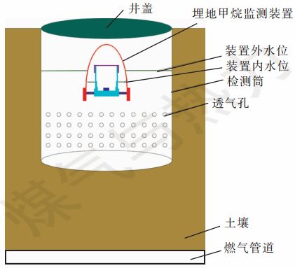 將埋地甲烷監(jiān)測(cè)裝置安裝在一個(gè)具有承壓及透氣功能的檢測(cè)筒內(nèi),檢測(cè)筒下方敞口,并與土壤接觸,內(nèi)部無(wú)土壤,檢測(cè)筒四周打孔,上方設(shè)置井蓋,井蓋與甲烷監(jiān)測(cè)裝置采用剛性連接,使得甲烷監(jiān)測(cè)裝置固定于檢測(cè)筒內(nèi),工作人員可以隨時(shí)對(duì)檢測(cè)筒內(nèi)的甲烷監(jiān)測(cè)裝置的傳感器及電池進(jìn)行校準(zhǔn)及更換。檢測(cè)筒安裝在管道正上方。參考目前的燃?xì)夤艿佬孤c(diǎn)定位打孔深度為0.5 m,因此,燃?xì)鈾z測(cè)筒的通常高度為0.5 m,可根據(jù)管道埋深增加檢測(cè)筒高度。甲烷監(jiān)測(cè)裝置及檢測(cè)筒的布置見(jiàn)圖1。
