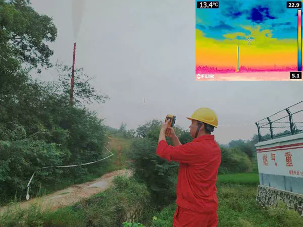 紅外熱成像儀監(jiān)測(cè)放空。因天然氣放空的節(jié)流效應(yīng),冷放空天然氣溫度與附近大氣存在一定差值,紅外熱成像儀將被測(cè)目標(biāo)的紅外輻射能量分布圖反映到光敏元件上,從而獲得紅外熱像圖。使用熱成像圖可監(jiān)測(cè)天然氣在大氣中的擴(kuò)散,發(fā)現(xiàn)異常情況可及時(shí)進(jìn)行工藝調(diào)整,確保風(fēng)險(xiǎn)受控。