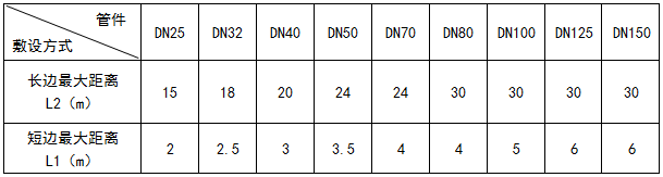 對(duì)于本文所述系統(tǒng)由固定點(diǎn)起,允許不裝補(bǔ)償器的直管段最大長(zhǎng)度民用建筑為33m,工業(yè)建筑為42m。(管道伸長(zhǎng)量分別為40mm和50mm)。實(shí)際設(shè)計(jì)時(shí)一般每段臂長(zhǎng)不大于20~30m,不小于2m。在自然補(bǔ)償兩臂頂端設(shè)置固定支架。“г”型補(bǔ)償器一般用于DN150以下管道;最大允許距離與管徑關(guān)系見(jiàn)表1。“Z” 型補(bǔ)償器可以看做兩個(gè)“г”型補(bǔ)償器。