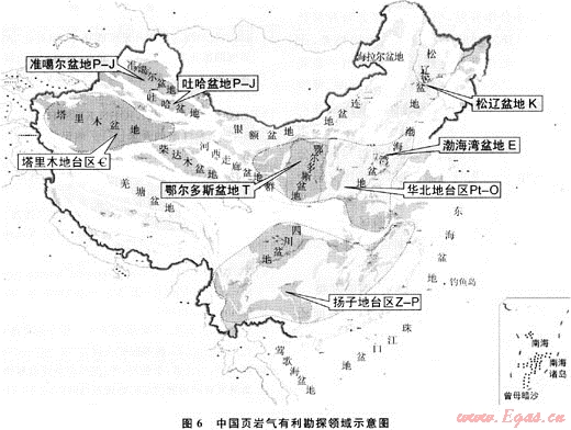我國中、新生界陸相沉積尤其發(fā)育,并已被勘探開發(fā)實踐證實其中的絕大部分富有機(jī)質(zhì)泥頁巖為含油氣盆地中的優(yōu)質(zhì)烴源巖,如松遼盆地下白堊統(tǒng)的青山口組黑色泥頁巖、渤海灣盆地古近系沙河街組的泥頁巖、鄂爾多斯盆地上三疊統(tǒng)延長組的張家灘(T3yc3)、李家畔(T3yc2)頁巖等。前人研究表明,中國北方陸相泥頁巖烴源巖母質(zhì)來源以浮游生物、細(xì)菌、高等植物為主,具有多種干酪根類型,TOC平均為2%~3%,最高可達(dá)8%,埋深2000~3000m,Ro為0.8%~1.2%,處于液態(tài)烴與氣態(tài)烴并重階段。其中在我國中西部地區(qū)的晚石炭世-二疊紀(jì)、晚三疊世-早中侏羅世還發(fā)育兩期煤系沉積,分布廣泛,天然氣資源豐富,煤層氣資源量約16.5×1012m3。對中-下侏羅統(tǒng)煤系沉積進(jìn)行研究,發(fā)現(xiàn)中-下侏羅統(tǒng)煤系中廣泛發(fā)育高碳泥頁巖,厚度為40~100m,TOC為20%~30%,Ro為0.8%~1.2%,母質(zhì)類型為腐殖型,是一套頁巖氣藏形成的有利目的層系。綜合多種地質(zhì)條件,認(rèn)為松遼盆地白堊系頁巖,準(zhǔn)噶爾盆地南緣上二疊統(tǒng)、中-下侏羅統(tǒng)頁巖,陜甘寧盆地上三疊統(tǒng)頁巖以及吐哈盆地中-下侏羅統(tǒng)碳質(zhì)頁巖是有利的頁巖氣形成層系和地區(qū)。