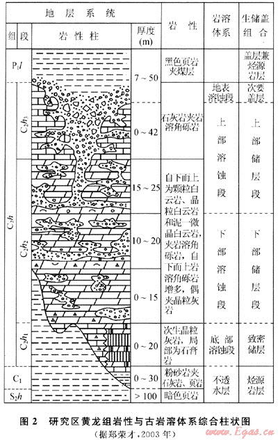 位于四川盆地東部的渝北-鄰水地區(qū)在范圍上包括重慶市的渝北區(qū)、北碚區(qū)和四川省的鄰水縣與華鎣山市,面積約3900km2(圖1)。上石炭統(tǒng)黃龍組為該地區(qū)天然氣主要產(chǎn)層,儲(chǔ)層屬于古巖溶成因類型[5~7],區(qū)內(nèi)發(fā)育有鄰北、板東、板橋、座洞崖、銅鑼?shí){、相國(guó)寺和環(huán)山等眾多次一級(jí)構(gòu)造控制的黃龍組氣藏,具備很大的勘探開發(fā)潛力。研究區(qū)石炭系受海西早期強(qiáng)烈構(gòu)造隆封和侵蝕作用,只殘存了不完整的上石炭統(tǒng)黃龍組拱不整合超覆在中志留統(tǒng)韓家店組暗色泥頁(yè)巖之上,頂面被下二疊統(tǒng)梁山組煤系地層超覆,自下而上被劃分為3個(gè)巖性和巖相截然不同的巖性段[8](圖2)。