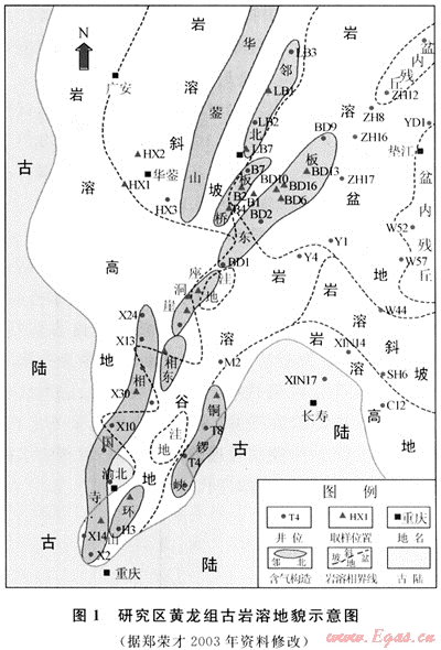 碳酸鹽礦物鍶同位素地球化學(xué)特征是碳酸鹽巖成因分析最重要的證據(jù)之一[1~2],近年來(lái)國(guó)外將鍶同位素地球化學(xué)特征廣泛地應(yīng)用于碳酸鹽巖石學(xué)、巖相古地理和儲(chǔ)層地質(zhì)學(xué)等研究領(lǐng)域中,而將其應(yīng)用到碳酸鹽巖古巖溶儲(chǔ)層中的成果則很少[3~4]。筆者僅就渝北-鄰水地區(qū)上石炭統(tǒng)黃龍組古巖溶儲(chǔ)層的鍶同位素特征對(duì)巖溶過程的流體性質(zhì)和古水文條件展開討論,為預(yù)測(cè)和評(píng)價(jià)此類儲(chǔ)層提供有關(guān)的地質(zhì)-地球化學(xué)信息。