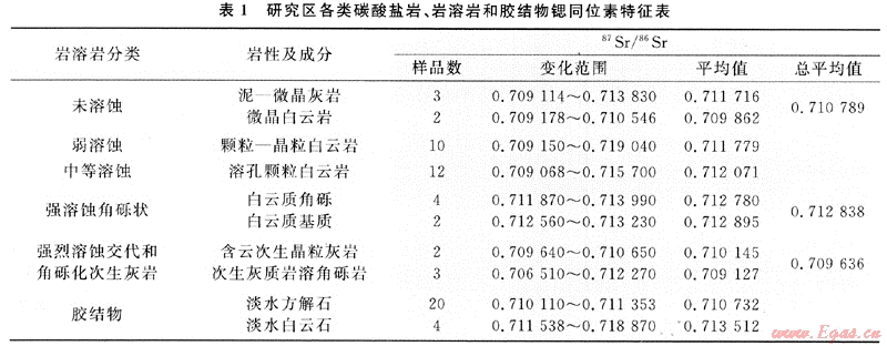 包括未溶蝕的正常海相泥-微晶灰?guī)r和薩勃哈環(huán)境的微晶白云巖,此兩類樣品的分析結(jié)果,主要用作為代表地層鍶同位素背景值和描述與對(duì)比巖溶巖系溶蝕過程中鍶同位素變化規(guī)律的參照物。