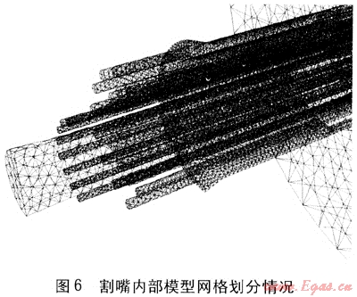 本文應(yīng)用CFD軟件對(duì)割嘴內(nèi)外圈氧氣與丙烷的流動(dòng)和燃燒做了冷態(tài)、熱態(tài)模擬。模擬計(jì)算的模型包括割嘴內(nèi)部氣體流場(chǎng)和割嘴外部空間氣體流場(chǎng)兩部分,因?yàn)楦钭焓侵行膶?duì)稱的,所以只模擬整個(gè)割嘴的一半。總體幾何模型見圖3,其中割嘴外部空間是直徑為200mm,長(zhǎng)度為1600mm的半圓柱體。割嘴內(nèi)部模型見圖4,包括高壓切割氧孔道、內(nèi)外圈預(yù)熱氧孔道、燃?xì)饪椎?。三維網(wǎng)格劃分情況見圖5、6,其中圖6是圖5的局部放大圖。