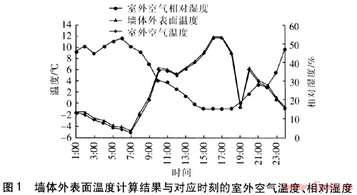 為了對太陽輻射條件下墻體外表面向內(nèi)側(cè)的傳熱量進(jìn)行分析,選定墻體結(jié)構(gòu)及材料熱工性能參數(shù)見表1,熱工性能參數(shù)滿足DB 63/643—2007《青海省居住建筑節(jié)能設(shè)計(jì)標(biāo)準(zhǔn)》。墻體外表面為淺色涂料,建筑物四周為綠色草坪。墻體外表面溫度采用有限差分法進(jìn)行計(jì)算,并采用ANSYS計(jì)算軟件對結(jié)果進(jìn)行校核。墻體外表面溫度計(jì)算結(jié)果與對應(yīng)時(shí)刻的室外空氣溫度、相對濕度見圖1。
