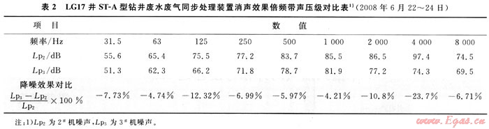 LG17井38機(jī)配帶ST-A型廢水廢氣同步消減裝置與2#機(jī)對(duì)比,排氣背壓(表1)與噪聲(表2)同步下降。鉆進(jìn)工況為柴油機(jī)轉(zhuǎn)速1200r/min,2#機(jī)排氣背壓實(shí)測值2.3~2.5kPa,3#機(jī)僅660Pa,降低70%以上。該工況下按噪聲監(jiān)測規(guī)范在3個(gè)方位分別檢測單開3#機(jī)和單開2#機(jī)的噪聲頻譜(表2),3#機(jī)倍頻帶消聲效果均優(yōu)于2#機(jī),2kHz以上高頻段降噪效果更明顯,4kHz降幅達(dá)最大值-23.7%。