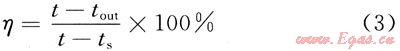 圖1的t-ts曲線還提供了與柴油機(jī)排氣溫度(t)相對(duì)應(yīng)的飽和溫度(ts),若實(shí)測同步處理后廢氣溫度下降到tout,則根據(jù)式(3)定義的設(shè)備運(yùn)行效率可判斷運(yùn)行狀態(tài),一般應(yīng)在90%~98%范圍。