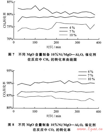 圖7、圖8為不同含量MgO-Al203載體制成10%Ni/MgO-Al203催化劑在反應中CH4和CO2的轉化率。從圖7、8中可以看出,在反應過程中10%Ni/4%MgO-Al203催化劑的催化活性最高,CH4和CO2轉化率分別為82%和90%左右。隨著反應的進行,10%Ni/4%MgO-Al203催化劑的催化活性略有浮動,但其轉化率仍然較高,在整個反應過程中催化劑的催化活性變化都不是很大,表明其穩(wěn)定性較好。