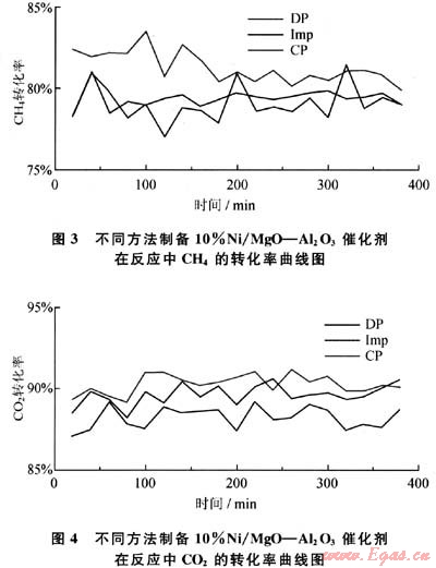 用不同方法制備4%MgO-Al203載體,用浸漬法負載Ni,制備成10%Ni/4%MgO-Al203催化劑,在常壓固定床反應器中測得CHn的轉化率(XCH4)和C02的轉化率(XCO2)(圖3、4)。從圖3、4中可以看出,在反應開始階段共沉淀法制備的載體催化劑的初始活性較高,可以超過90%,高于沉積沉淀法和浸漬法的催化活性,隨著反應時間的進行,CH4和C02的轉化率始終保持較高,但反應進行4h后,催化劑發(fā)生了積炭,催化活性有所降低,說明其穩(wěn)定性不是很好。