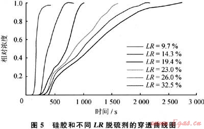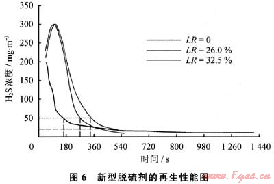 我國(guó)GB 17820一1999《天然氣》規(guī)定,城市管道天然氣中硫化氫含量標(biāo)準(zhǔn)為:一類天然氣中硫化氫含量不大于6mg/m3,二類天然氣中硫化氫含量不大于20mg/m3,三類天然氣中硫化氫含量小于460mg/m3。而GB 18047—2000《車用壓縮天然氣》規(guī)定,車用壓縮天然氣中硫化氫含量不大于15mg/m3。由圖5可以看出,LR>14.3%的脫硫劑,硫化氫穿透時(shí)間長(zhǎng)于300s,即300s內(nèi)產(chǎn)品氣中不含硫化氫,符合一類城市管道天然氣和車用天然氣用氣要求。