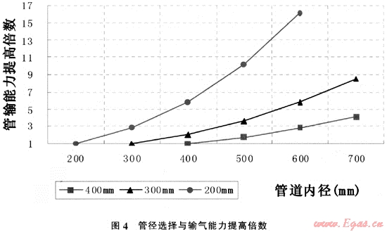 舊有的管網(wǎng)系統(tǒng)中管徑較小的管道有可能是制約管網(wǎng)通過能力的瓶頸。通過管網(wǎng)計(jì)算,北京市中壓管網(wǎng)主干線個(gè)別管段由于管徑較小,嚴(yán)重阻礙了管網(wǎng)輸送,應(yīng)將此管段進(jìn)行擴(kuò)徑,如香山南路管線,管徑為DN400。全長4000m。其中有一段DN100,導(dǎo)致附近壓力偏低,若將此段管線改為DN400,附近壓力由0.04MPa,升到0.06MPa。圖5所示為擴(kuò)大管徑對(duì)管輸能力提高倍數(shù)的影響,計(jì)算式: