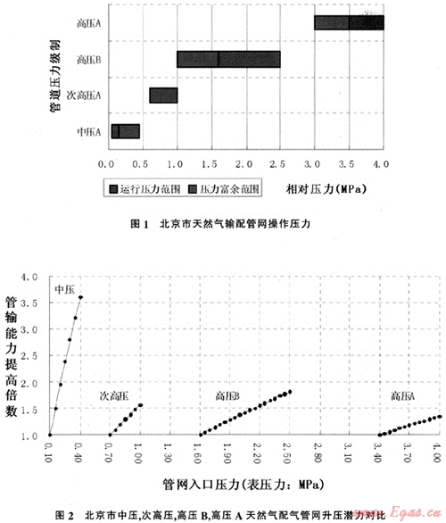 2008年—2009年冬季高峰日輸送氣量為4230萬m3,小時(shí)高峰輸送量為210萬m3。自1997年以來,年高峰日輸送量平均增長率超過40%。若實(shí)現(xiàn)北京市120億m3天然氣供應(yīng)量目標(biāo),據(jù)測(cè)算,高峰輸送量為10500萬m3,高峰小時(shí)輸送量為580萬m3。在現(xiàn)有管網(wǎng)最大運(yùn)行壓力下,提高輸送能力的方法。一是增加進(jìn)氣點(diǎn)既建調(diào)壓站,二是增加管線建設(shè)。北京天然氣高壓以上管線僅占總管線長度的8.6%,合理增建高壓管線是有必要的,也是有條件的。但中壓管線已占總管線長度的40%,中壓天然氣管線幾乎遍布市區(qū)所有主干公路,據(jù)北京天然氣管網(wǎng)規(guī)劃。2020年中壓管網(wǎng)輸送能力將由目前150萬m3增加到255萬m3。單靠增加中壓管線建設(shè)提高管網(wǎng)輸送能力即不經(jīng)濟(jì)也不現(xiàn)實(shí)。因此,如何提高現(xiàn)有管網(wǎng)的輸送能力,是我們亟待解決的問題。