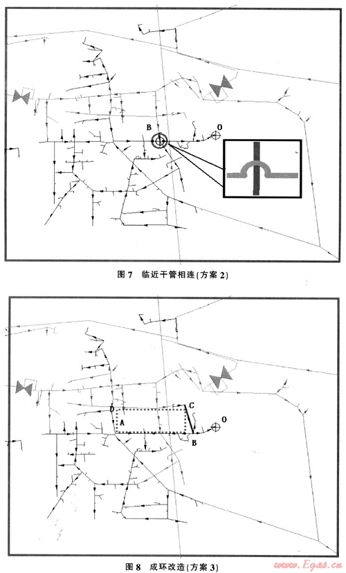 通過案例分析可以看出,最好的方案是管線相交處或相鄰處管線連接起來,其次是管網(wǎng)成環(huán),并行干管最差。但選擇哪種改造方案還要根據(jù)實(shí)際施工條件來確定。一般來說,應(yīng)首先采用連通線增設(shè)和成環(huán)改造方案,可使其效益最大化。